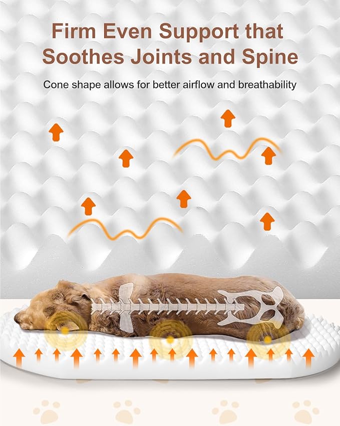 - 【Plush Sleeping Area with Thick Supportive Base】With a 3.7-inch thick 28D egg-crate foam padded base, this orthopedic bed delivers a perfect balance of softness and resilience. The cushioning distributes your dog’s weight evenly, minimizing pressure points and supporting joints—especially beneficial for large breeds prone to hip or elbow issues. The ultra-soft plush surface provides warmth and comfort. Whether your dog prefers to sprawl or curl up, this bed ensures restorative sleep, improving overall well-being and energy levels