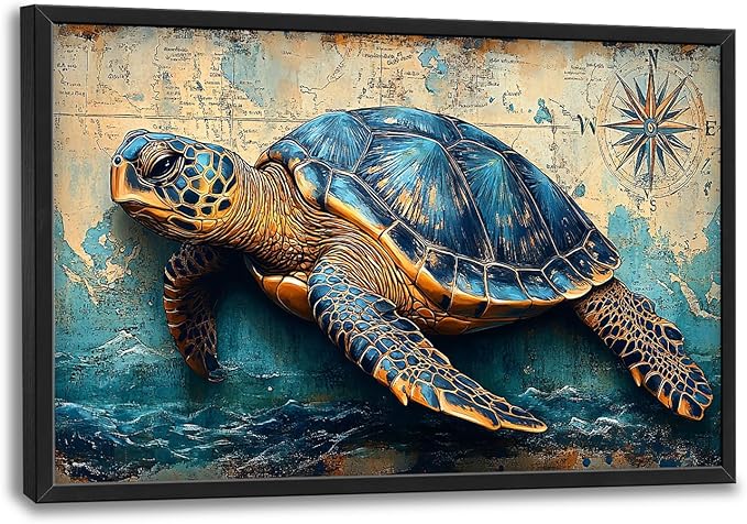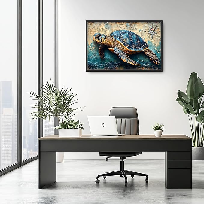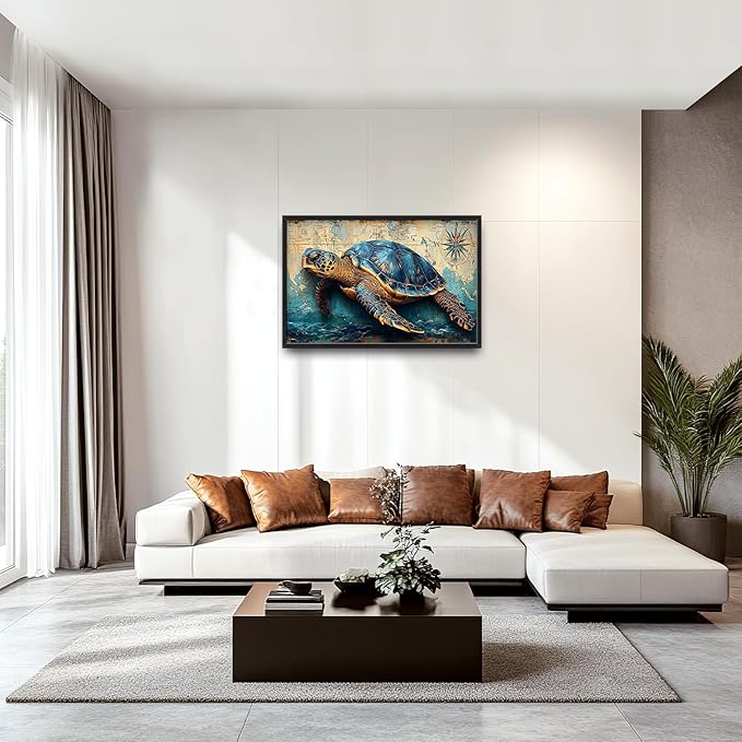 Large Nautical Turtle Wall Art for Living Room, Coastal Ocean Canvas Oversized Wall Decor, Beach Aesthetics Framed Pictures Painting Print Artwork for Bedroom Office 36L" x 24W"