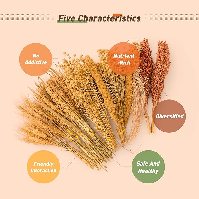 - Abundant Variety & Great Value: Enjoy large quantities at an affordable price. Features rich mixes: the 5-type blend includes rice ears, wheat ears, flax seed ears, yellow millets, and millet ears; the 7-type blend adds red and white sorghum for endless enrichment.