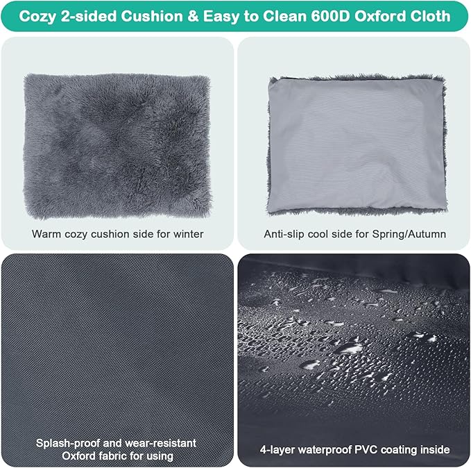 - Double-sided Cushion & Easy Installation: The cushion of this pet house is made of long velvet and oxford cloth, PP cotton. The Oxford cloth side is cool and scratch-resistant which is suitable for spring to autumn. While the velvet side is warm and cozy for winter. The cushion cover can be removed so it's easy to clean. Our products are easy to install. After testing, several of our colleagues spent less than 30 minutes to complete the assembly