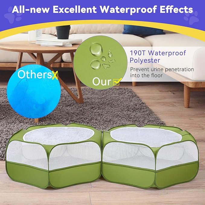 - NO MESS - WATERPROOF FABRIC: Playpen tent bottom is made of 190T waterproof polyester taffeta that effectively prevents urine from seeping through to the floor. The top mesh with a dual-zippered opening is easy to clean and allows power cords to pass through. (NOTE: For your small pet animals' health, please clean up the water stain in time.)