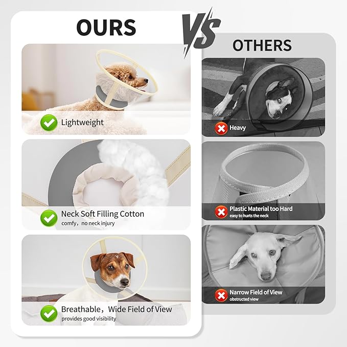 - Upgraded Design: The cone of the dog is made of lightweight and breathable mesh material, and cotton padding is added to the neck, which is super soft to maximize the dog's comfort and reduce its anxiety during recovery, and will not irritate the skin. Compared with traditional full-cloth neck cones, the mesh material is easier to clean, dries quickly, and keeps the dog's activity space clean