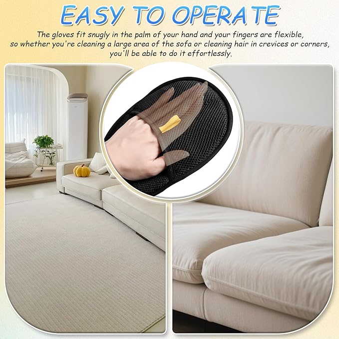 - EASY TO OPERATE: The gloves fit snugly in the palm of your hand and your fingers are flexible, so whether you're cleaning a large area of the sofa or cleaning hair in crevices or corners, you'll be able to do it effortlessly.