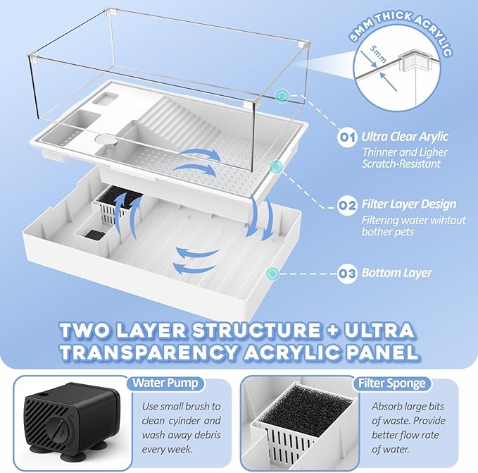 - 【TWO-LAYER DESIGN - EASY TO CHANGE WATER】Turtle tank base is a 2-layer separated design. Lift the first layer, food residue and excretion will sink into the bottom layer, then you can pour out all watse in the bottom layer and add fresh water; Save your time and trouble to drainage from a tiny hole slowly. During the process, your pet and other decorations in the tank just need to stay put and remain undisturbed. Note: Water should be refreshed 1-2 times per week, even with water pump.