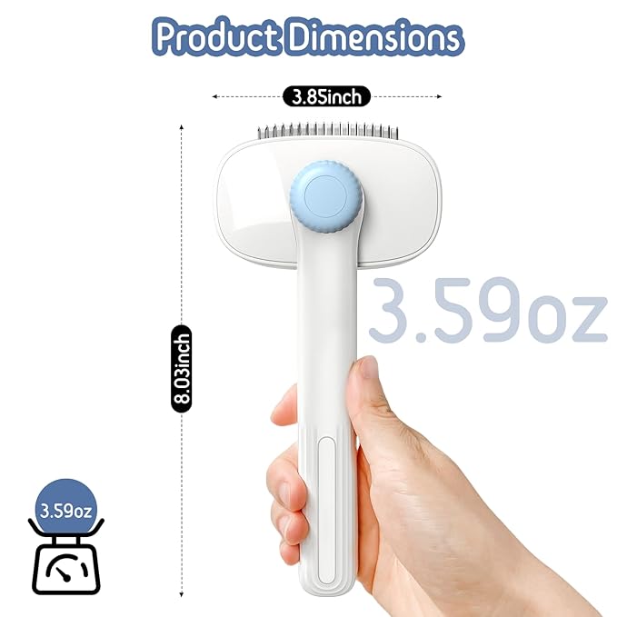 - One-click Cleaning Button: After brushing your pet, simply click the button. The shutter will pop out, separating the brushed hair from the metal needle, then wipe the hair off. The button of cat shedding brush on the handle saves time and energy when grooming and cleaning