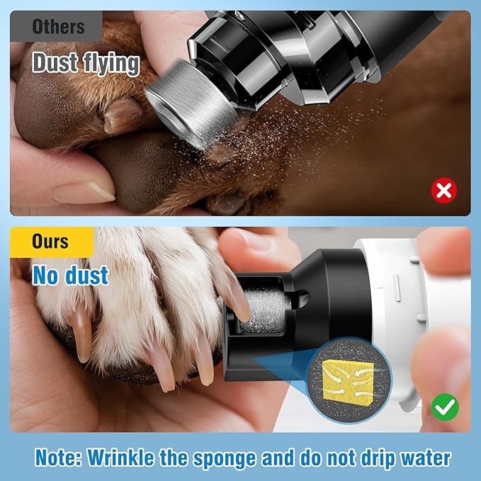 - Dust Sponge Design: No more worrying about nail dust flying everywhere when trimming your dog's nails. Our dust sponge absorbs most grinding dust, keeping floors clean while effectively preventing dust inhalation by both people and pets