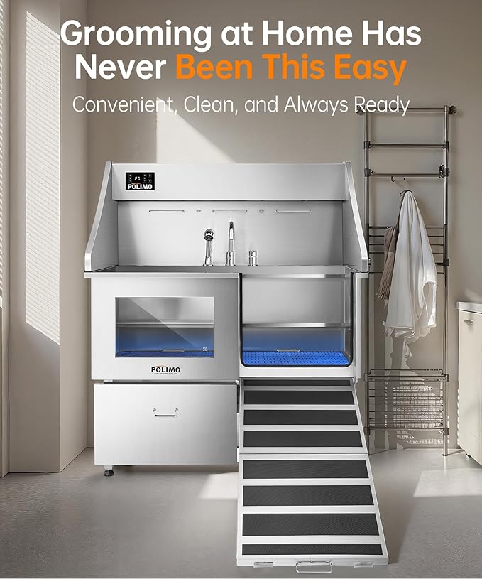 - Premium Stainless Steel Build & Smart Design : Crafted from rust-resistant 304 stainless steel with a full-welded, leak-proof structure, this dog tub is built to last. It features a Grade-A tempered glass viewing window (Eases pet anxiety); A foldable ramp (For easy access, especially for senior dogs); A removable two-piece floor grate (3 height adjustments for large, medium, and small dogs); And a sliding storage drawer (Keeps grooming tools organized). Every detail is designed for a more professional, comfortable, and efficient dog shower tub experience