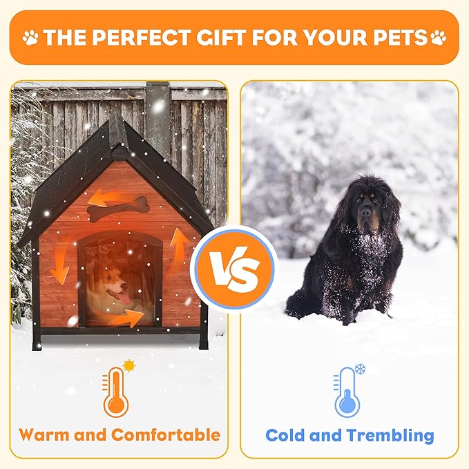 - [Specially Designed for Outdoor Use] The sloping asphalt roof is expertly engineered to prevent rainwater from pooling, ensuring that your pet's living space remains dry and comfortable. The floor is 2.4’’ above the ground, and there is a removable PVC curtain and adaptable floor pads for uneven ground. This design enables the dog house to withstand harsh weather conditions, preventing water from seeping in and materials from getting damp