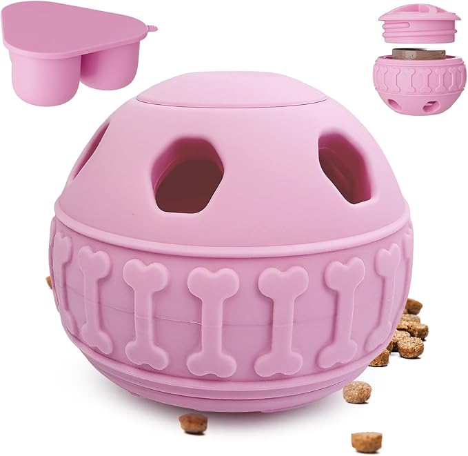 - 【Dog Slow Feeder Toy】: Plug the top hole with a silicone stopper to allow food to gradually leak out through the side holes. Dogs must roll or push the ball to get the food inside. This process not only provides healthy exercise but also significantly enhances your pet's intelligence and brain vitality, making it a great dog treat toy.