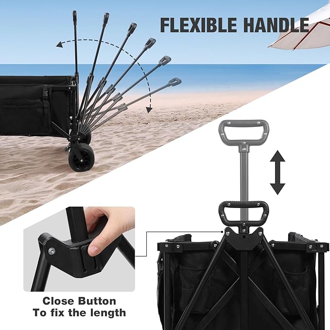 - Adjustable Handle: The collapsible utility beach cart features an handle that can adjust the angle you need. The length of the pull rod adopts telescopic design, so that the pull rod can be contracted for convenient storage when not in use.