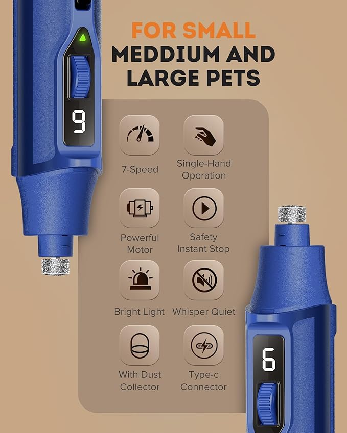 • 7 SPEEDS ADJUSTABLE: Ranging from 8,000 to 15,000 RPM, as one of the most powerful grinders, ideal for trimming the nails of small, medium, and large dogs, cats, birds, and other small animals